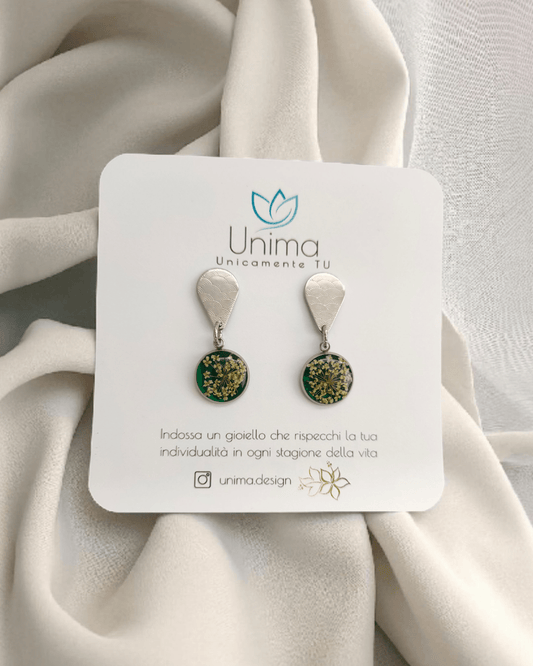 Orecchini CROMOSFERA con resina verde e fiore "Pizzo della Regina Anna"