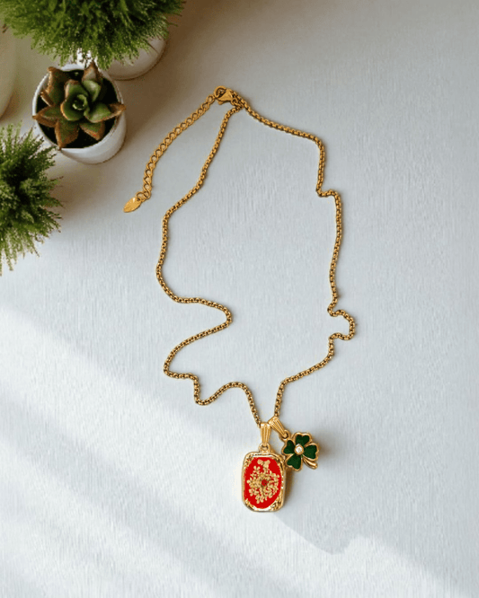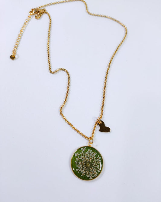 Collana LIORA - Resina rossa, fiore Pizzo della Regina Anna e quadrifoglio verde